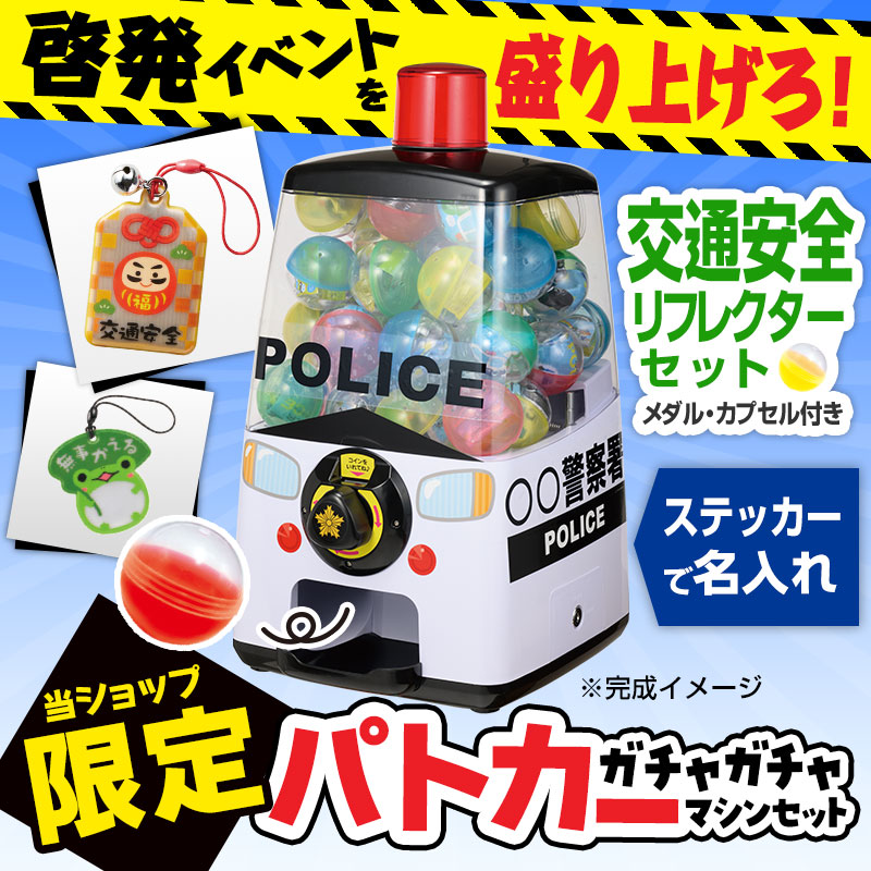 パトカーモチーフ・デザインのグッズはもちろん、ガチャガチャ本体までパトカー仕様にしたスペシャルセットをご用意しております。