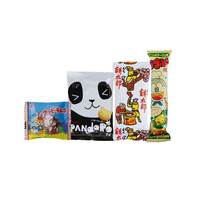 内容:クッピーラムネ・ぱんだろ~・うまい棒コーンポタージュ味・餅太郎 各1 アレルギー:乳・小麦・卵 賞味期限:60日