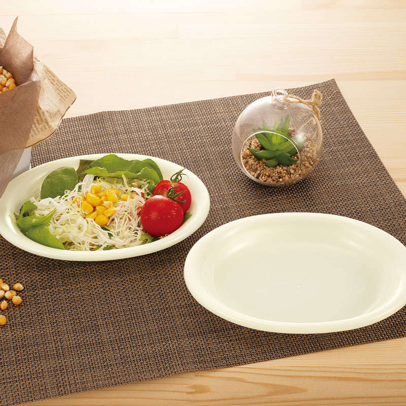 化石由来原料の代わりに、バイオマス素材としてとうもろこしのでんぷんを配合。ちょっとしたおつまみを入れたり、取り分け皿として使いやすいサイズのプレートです。