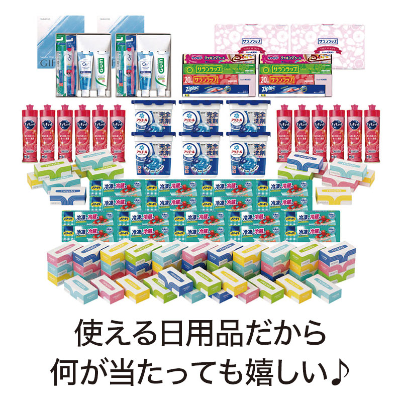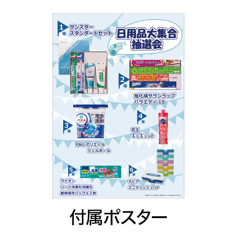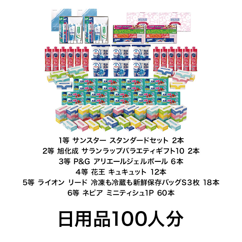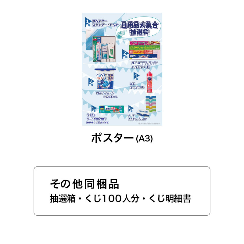 | その他詳細 | 内容:1等 サンスタースタンダードセット 2本・2等 旭化成サランラップバラエティギフト10 2本・3等 P&Gアリエールジェルボール 6本・4等 花王キュキュット 12本・5等 ライオンリード冷凍も冷蔵も新鮮保存バッグS3枚 18本・6等 ネピアミニティシュ1P 60本・抽選箱・くじ100人分・くじ明細書・A3ポスター 各1 日本製 |