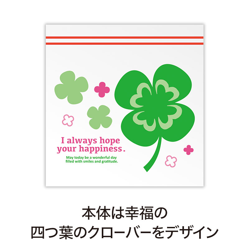 中身は、だれもが「もらって嬉しい」鉄板アイテム「ジッパーバッグ」で、幸運の四つ葉のクローバーをデザイン、3枚セットにいたしました。