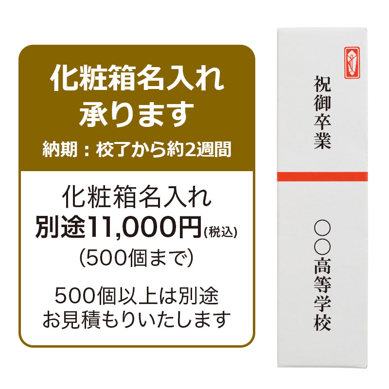 | 名入れ価格(円/税抜) | 125(版代:10,000) 化粧箱名入れ:別途10,000円(500個まで)にて承ります(納期は校了から約2週間) ※500個以上は別途お見積りいたします |
