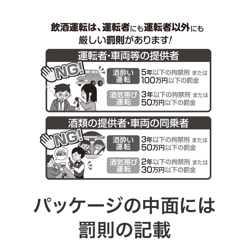 パッケージ中面には、飲酒運転の罰則を掲載しています。