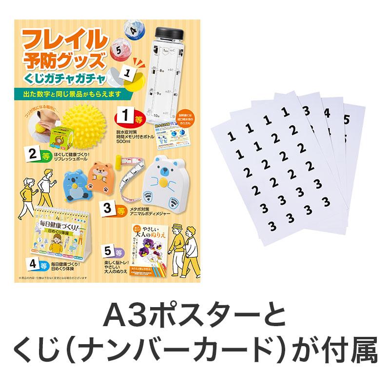 | その他詳細 | 内容:フレイル予防グッズ×100(脱水症対策時間メモリ付きボトル 500ml×6・ほぐして健康づくり!リフレッシュボール×10・メタボ対策 アニマルボディメジャー×16・毎日健康づくり!日めくり体操×24・楽しく脳トレ!やさしい大人のぬりえ×44)・ナンバーカード×5シート・A3ポスター |