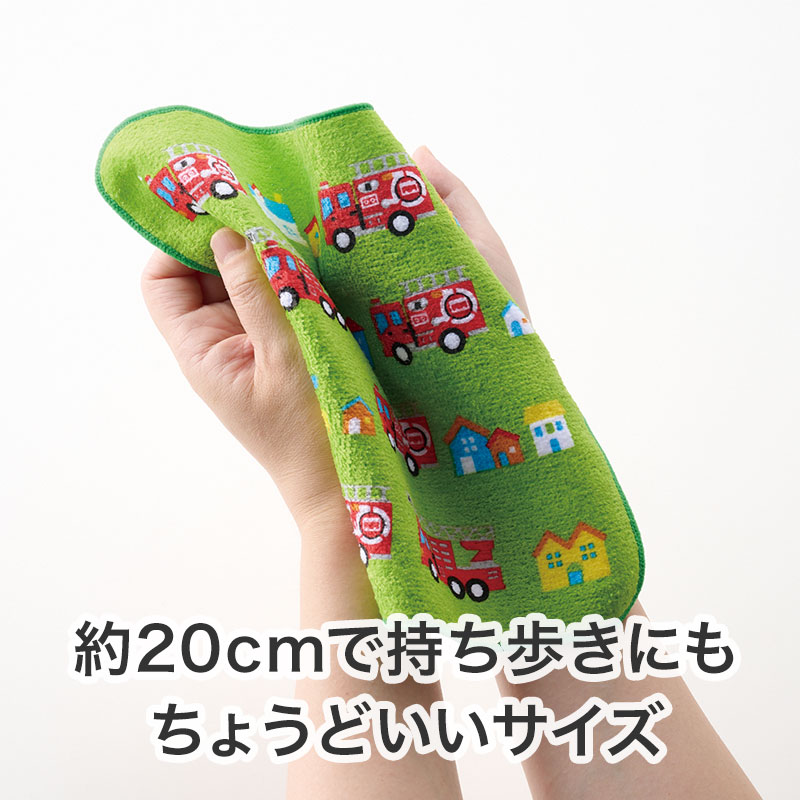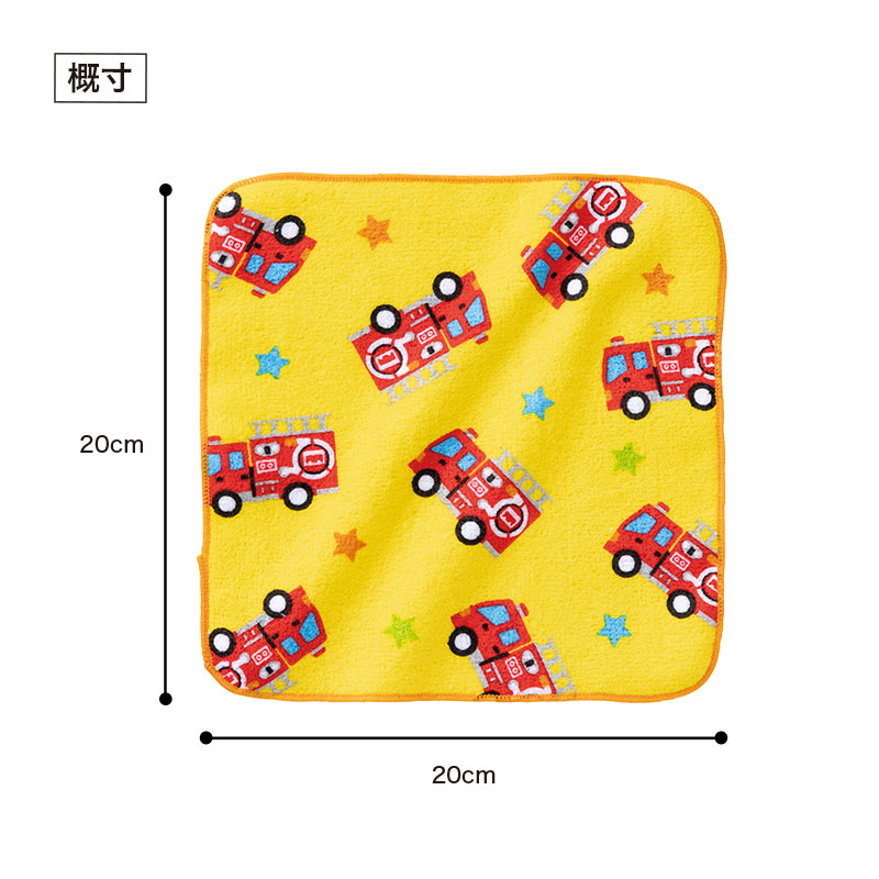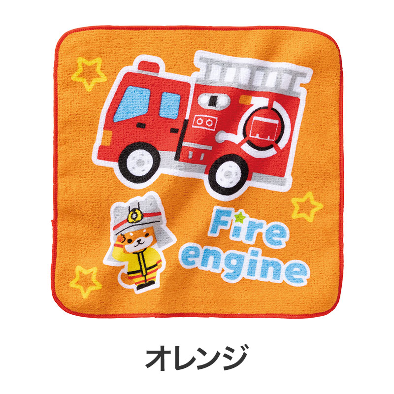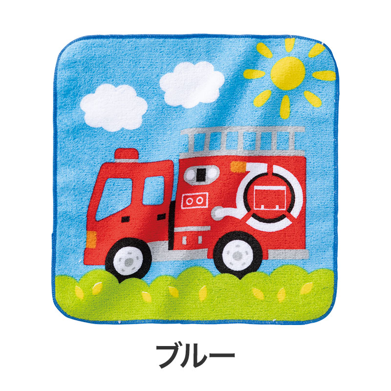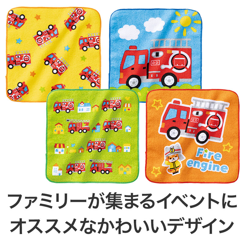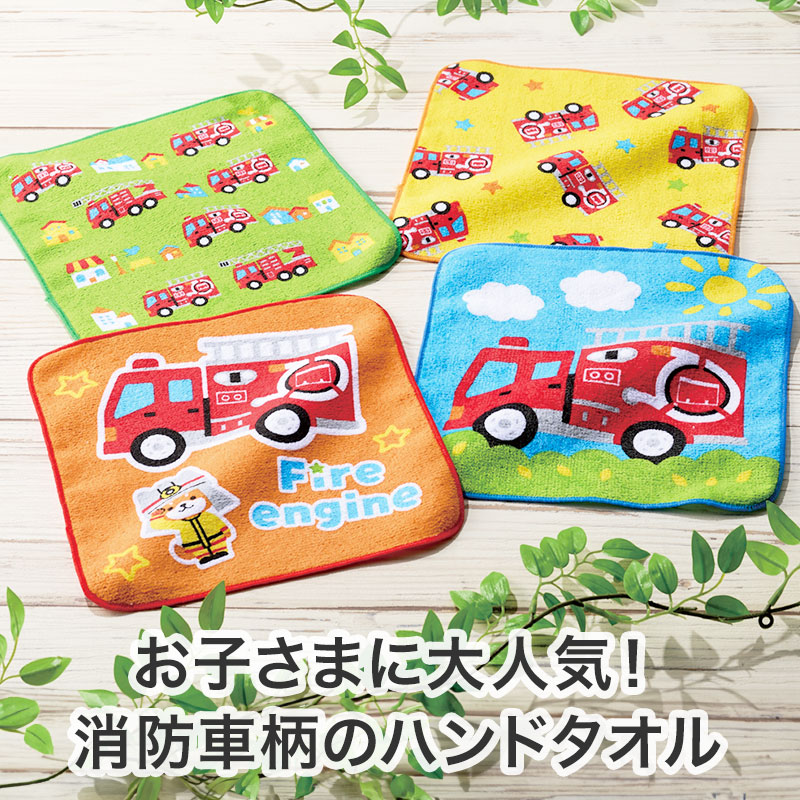 お子さまに大人気の消防車柄をデザインした、かわいいハンドタオル。