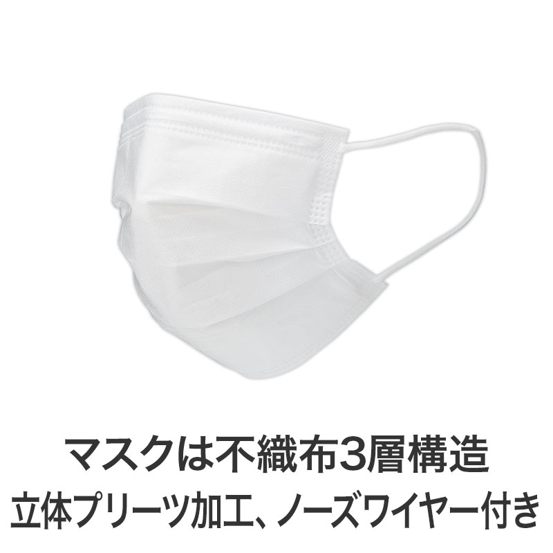 不織布マスクは、不織布3層構造、立体プリーツ加工、ノーズワイヤー付きと、しっかりしたつくりです。