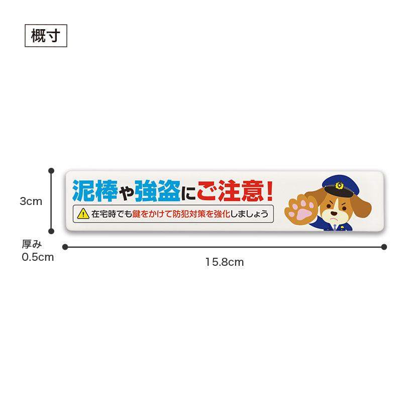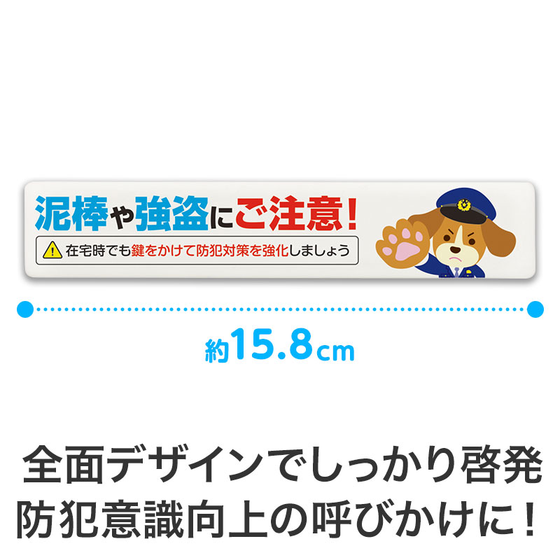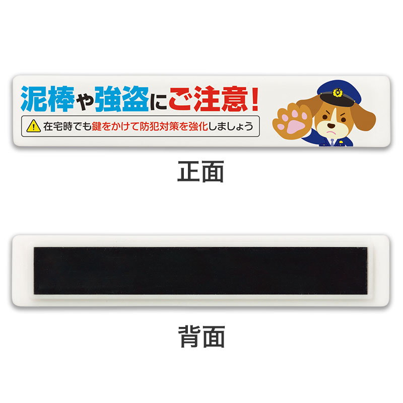 日常的に使えるマグネットバーに「泥棒・強盗にご注意!」と大きく印刷し、防犯意識をしっかり高められるアイテムです。