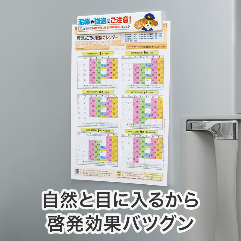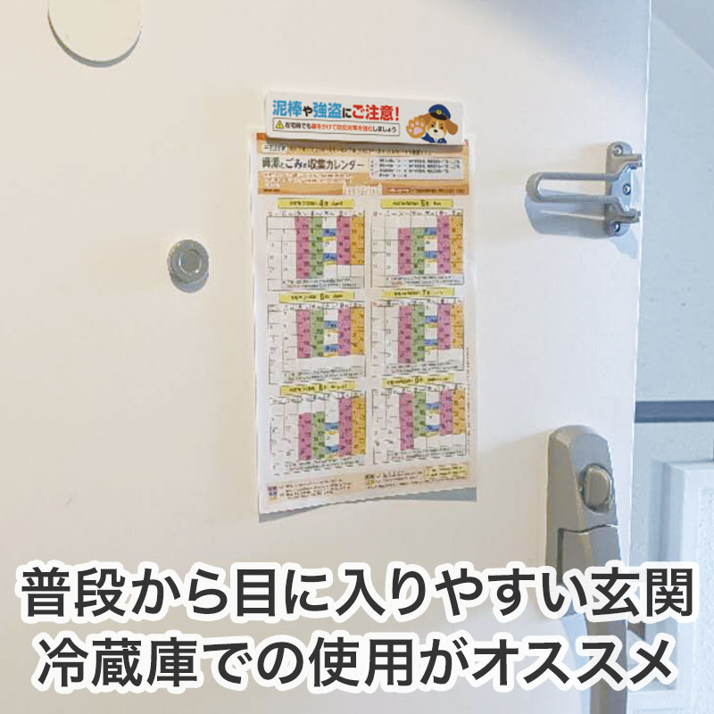 A4用紙を最大10枚まで留められる実用性もあり、チラシ等の啓発資料と一緒に配布すれば、「読む・見る・貼る」の3ステップで無理なく防犯意識を定着させられます。