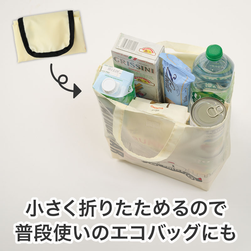 使用後はサブバッグや日常のエコバッグとしても活用でき、折りたたんで面ファスナーで留めればコンパクトに携帯可能です。
