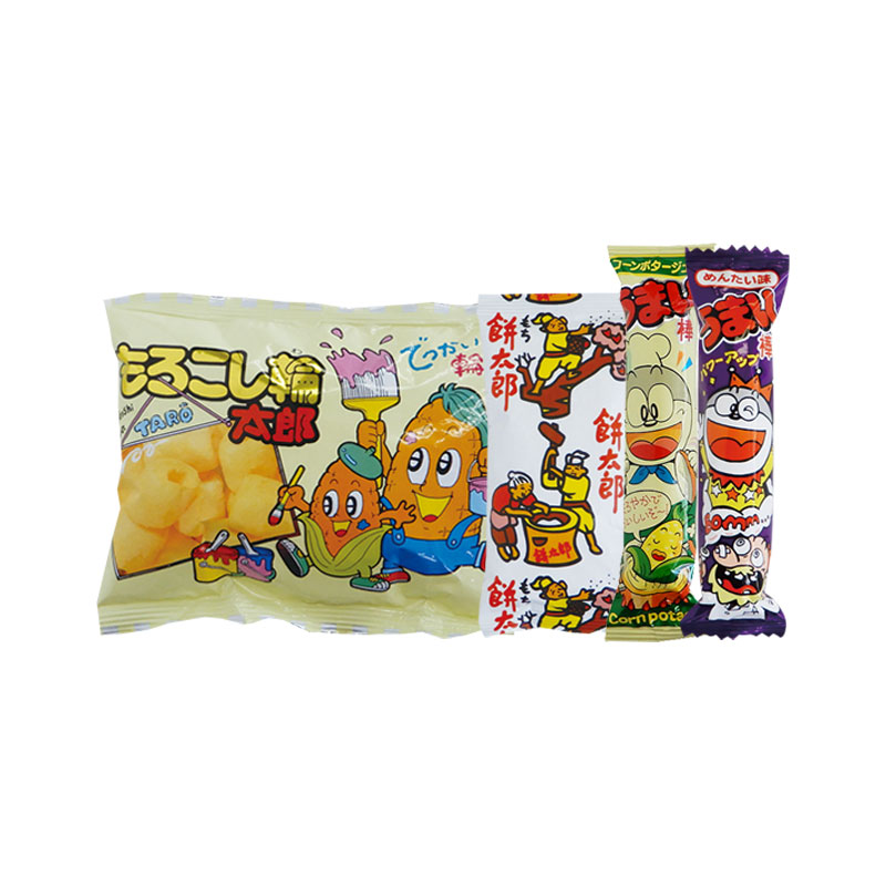 鮮やかなオーナメント柄デザインのバッグには、誰もが一度は食べたことがある人気の駄菓子4点が入っています。