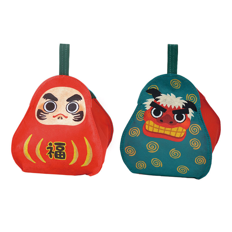 だるまとししまいが裏表にデザインされた楽しいバッグには、誰もが一度は食べたことがある人気の駄菓子4点が入っています。