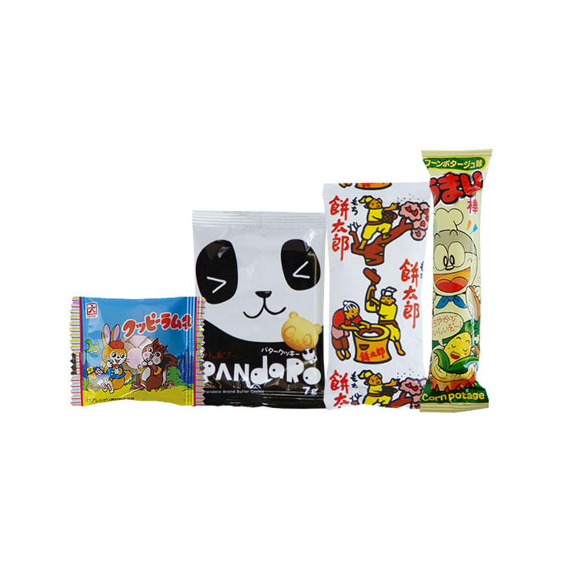 内容:クッピーラムネ・ぱんだろー・餅太郎・うまい棒 各1 アレルギー:乳・小麦・卵 賞味期限:60日