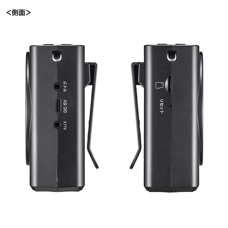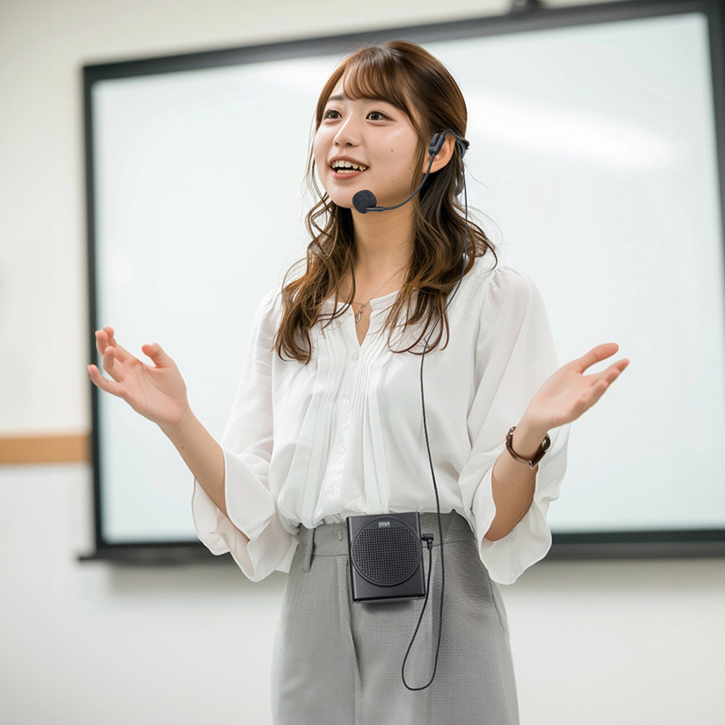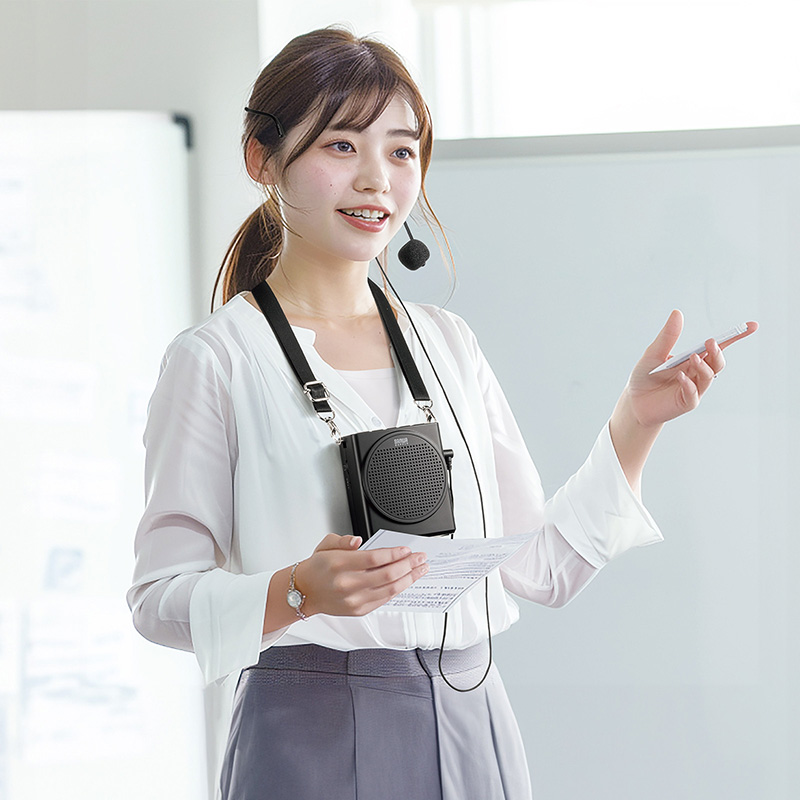体に装着できるので、動きながらハンズフリーで拡声できます。