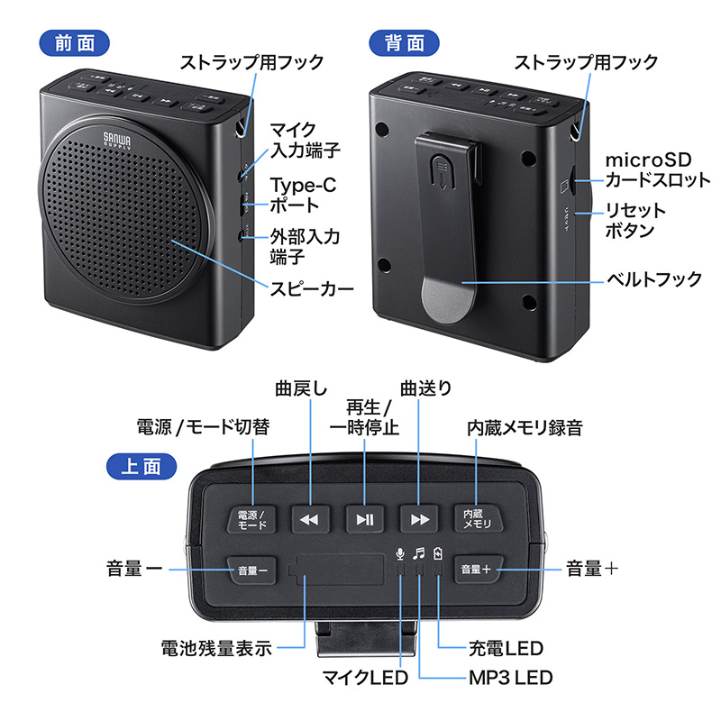 拡声器本体は軽量かつコンパクトで、持ち運びに便利な設計です。