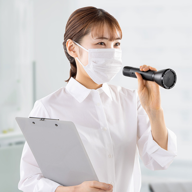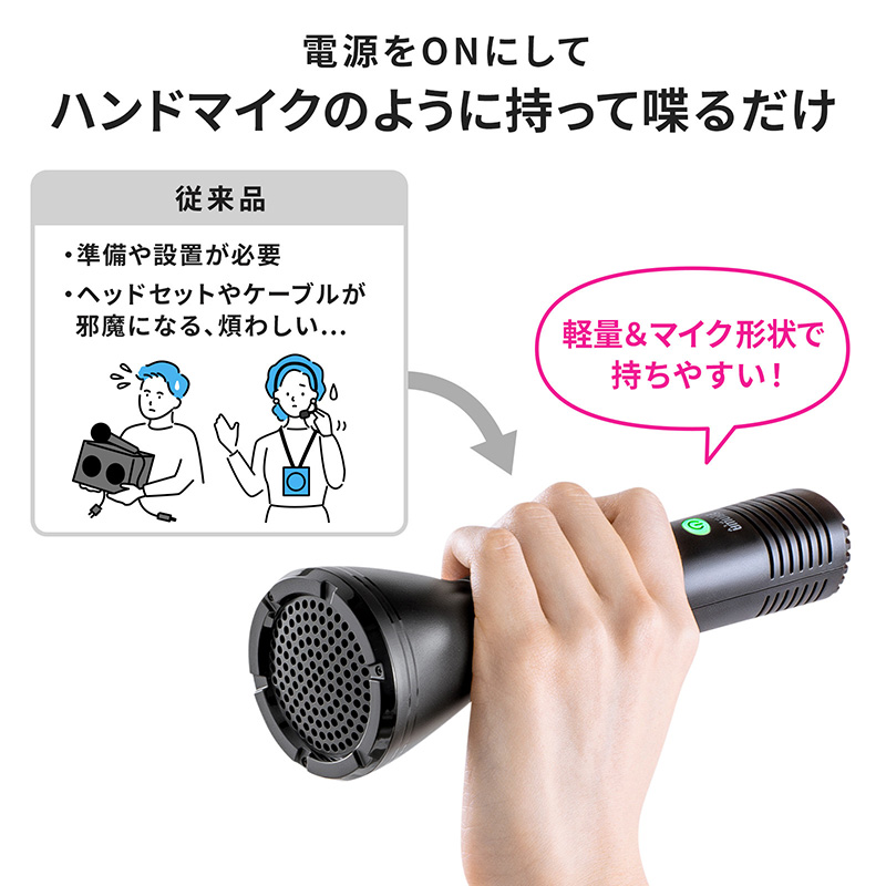 電源をONにしてマイクのように持って喋るだけで拡声できるので、お子さまから高齢者まで誰でも簡単に使えます。