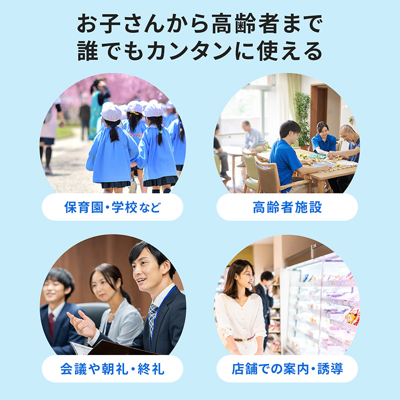 小規模のイベント・説明会/セミナー・講義・講話/保育園・学校などの教育施設/高齢者施設/会議や朝礼・終礼/店舗での案内・誘導等、様々なシーンで使用できます。