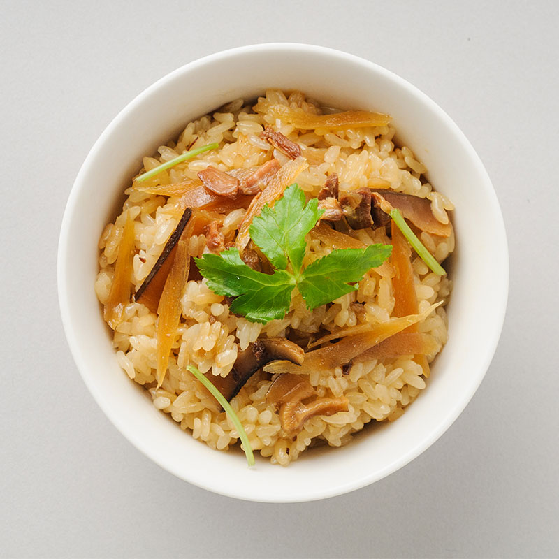 国産のやわらかな鶏もも肉と香り豊かなごぼう、しいたけは相性抜群。素朴だけれど旨みが広がる味わい深いおこわです。